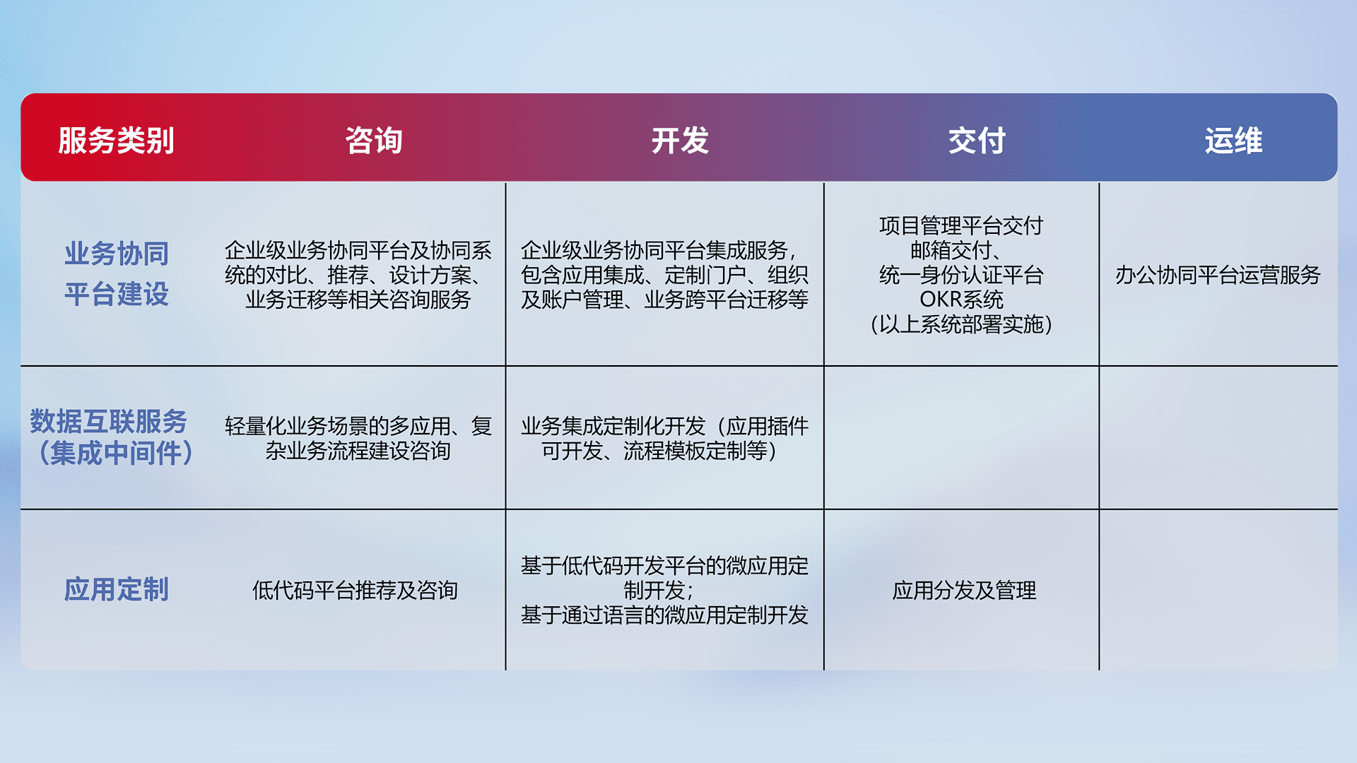 针对钉钉、、、企微、、、IDaas等平台级产品提供产品的规划、、、方案、、交付、、定制化开发等服务,,,,实现如统一协同办公、、智能客户服务、、、、混合会议管理、、智能数据查询、、等业务场景,,实现数字化转型。。